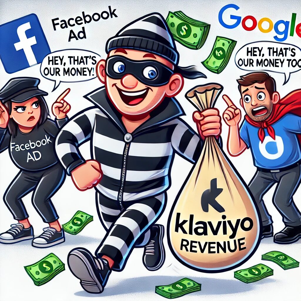 If a customer sees a Facebook ad, then later opens an email and buys, Klaviyo claims 100% of that revenue.